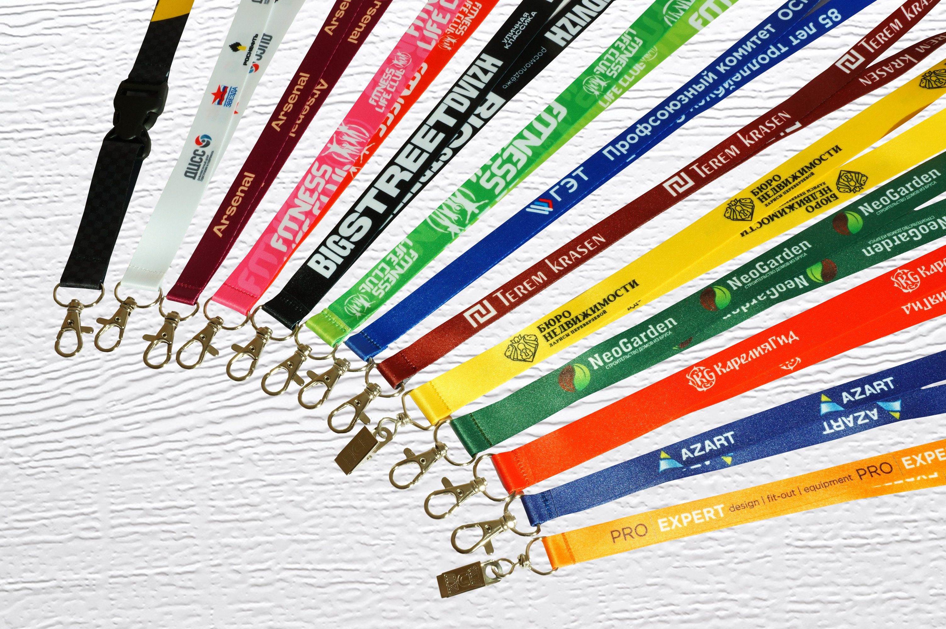 Ленты для бейджей и ланъярды с печатью логотипов. Полноцветная печать по всей площади ленты! Фурнитура в наличии
